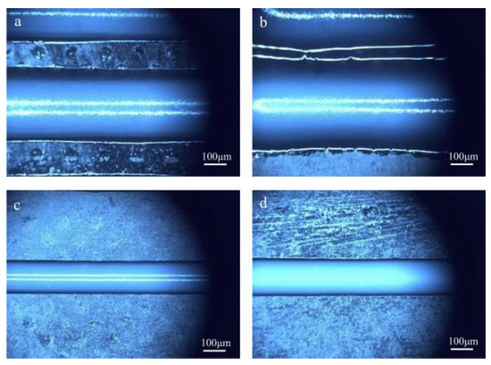 Images of the filament width of different inks by different printing methods: (a) PTFE 15 wt% by UFC; (b) PTFE 15 wt% by DIW; (c) PTFE 25 wt% by UFC; and (d) PTFE 25 wt% by DIW.