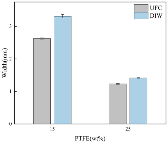 From the printing results of the 15 wt% PTFE ink (Figure 6b,d), it can be seen that the filament printed by DIW had uneven edges, poor uniformity, and a significantly larger filament width than the nozzle diameter. This was because the low viscosity of the ink caused it to flow like a fluid before curing, leading to collapsing, uneven edge formation, and large variations in filament width that exceeded the nozzle dimensions. By contrast, when using the UFC method, the edge flatness of the filament improved, with smaller molding diameters for the filaments, a reduced standard variance, and enhanced uniformity. For the 25 wt% PTFE ink, both methods resulted in relatively flat edges for the filaments (Figure 6c,d). Compared to the 15 wt% PTFE ink, the printing filament width was reduced, especially in the case of UFC printing, where the filament width closely approached the nozzle dimensions.
