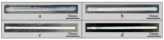 Images of the filament length of different inks by different printing methods: (a) 15 wt% PTFE by UFC; (b) 15 wt% PTFE by DIW; (c) 25 wt% PTFE by UFC; and (d) 25 wt% PTFE by DIW.