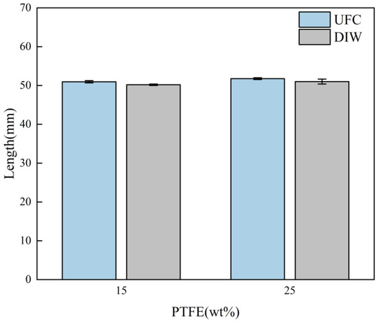 The deviation results between the printed length and the set length are shown in Figure 9. The experiments indicated that, for inks with low viscosity and fluid properties (15 wt% PTFE), the actual length of the filaments printed by UFC was 50.96 ± 0.28 mm, while the length printed by DIW was 51.77 ± 0.24 mm. The length deviation was significantly reduced in the UFC printing method. For inks with creep properties (25 wt% PTFE), the actual length of the filaments printed by the UFC method was 50.19 ± 0.18 mm, and the actual printed length by DIW was 51.02 ± 0.64 mm. The UFC printing method also reduced the length deviation accordingly. The length error of the 15 wt% PTFE ink filaments was reduced by 1.8% and that of the 25 wt% PTFE ink was reduced by 1.4%. This shows that the UFC printing method can improve dimensional accuracy in length, especially for inks with low viscosity and poor shaping ability.