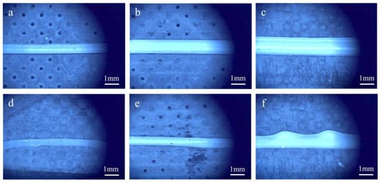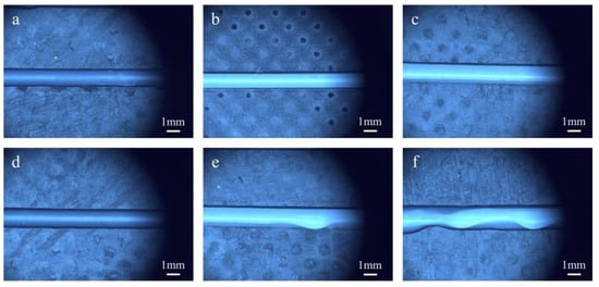 The filament dimensions in DIW are critical factors that significantly impact the overall structural accuracy. The precision and consistency of the filament size serve as the fundamental basis for ensuring accuracy. To assess the impact of the UFC printing method on dimensional accuracy by examining line dimensions, an experiment involving filament printing was conducted using a nozzle diameter of 0.84 mm, a nozzle movement speed of 1.0 mm/s, and an extrusion pressure of 0.2 MPa. The printing parameters are shown in Table S4. The extrusion process is shown in Figure 5. The CCD system was employed to analyze the filament dimensions.