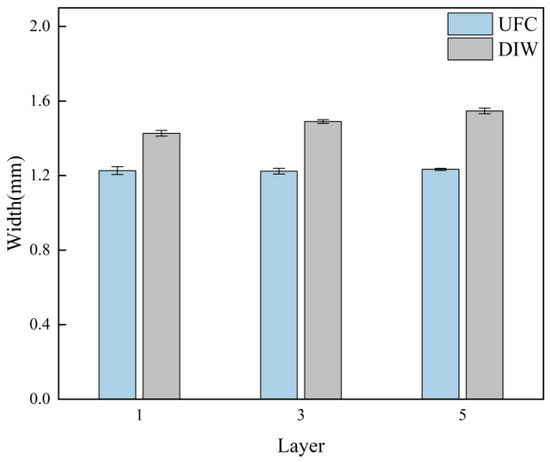 Figure 10 shows the top-view of the stacked single walls formed by different printing methods. The width of the stacked layers was measured. From the measurement results (Figure 11), it could be seen that, under the same printing parameters, the width of the filaments stacked at different layer heights printed by UFC was smaller than that of filaments printed by DIW. Evidently, UFC could promptly cure the filaments with low yield stress. During the extrusion process, there was no dimensional expansion, irregular shape, or influence on verticality caused by material flow and creep. This indicated that the UFC printing method could improve the dimensional accuracy of the line width of the stacked filaments.