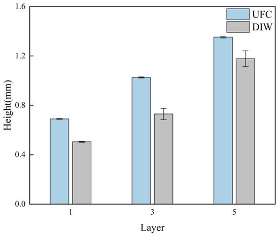 Figure 14 shows the cross-sectional morphology diagrams of filament-diameter stacking at different printing layer heights under different printing processes. It can be observed that, for the filaments printed by DIW, the cross-sectional contour had an irregularly shaped boundary. The bottom layer experienced collapse and deformation, presenting an overall cross-section which was wider at the bottom and narrower at the top. Especially when stacking several layers, when printing the subsequent layer, the previous layer had not solidified yet. Due to the low-viscosity ink’s lack of shape retention, the preceding layer deformed under the weight of subsequently deposited layers, leading to significant distortion of the cross-sectional profile and dimensional accuracy.. From the cross-section of the filaments printed by UFC, it could be seen that the superposition of a subsequent layer hardly affected the shape of the previous layer. The bottom layer did not collapse, and the overall morphology was relatively good, with a certain degree of perpendicularity. Evidently, UFC could improve the cross-sectional morphology and dimensional accuracy of the single wall.