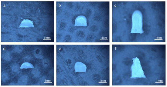 Figure 15 shows the ring-forming effect diagrams of inks with different yield stresses printed by two printing methods, UFC and traditional DIW. When using the DIW method (Figure 15b,d), phenomena such as extrusion filament collapse, poor uniformity, and inconsistent filament diameters occurred. In particular, when using the low-viscosity and low-yield-stress PTFE 15 wt% ink with fluidity, the dimensional error increased significantly, and the extruded filaments exhibited severe shape distortion, failing to retain the designed geometry.. When using the UFC printing method (Figure 15a,c), the morphology of the extruded filaments was improved. The extruded filament is uniform, the molding is good, and the phenomenon of broken filament is basically eliminated. Moreover, under the same printing method, the higher the yield stress of the ink, the better the formation. This indicated that UFC could significantly improve the shape-forming effect.