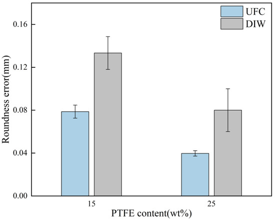 To characterize the shape accuracy of the circles of different printed samples, roundness error tests were conducted on the printed samples, respectively. The test results are shown in Figure 16. The error range was between 0.04 and 0.12 mm. For the low-yield-stress ink with fluidity (15 wt% PTFE), the roundness error of the rings printed by the UFC process was reduced by 0.06. For the low-yield-stress ink with creep properties (25 wt% PTFE), the roundness error of the rings printed by the UFC process was reduced by 0.04. This verifies that UFC has better shape accuracy for low-yield-stress inks.