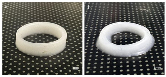 To explore the influence of the UFC printing method on extruded filament forming, single-filament ring printing was carried out. The printing parameters are shown in Table S7. With the other parameters kept constant, the morphological characteristics and filament diameters of the extruded rings made of low-yield-stress silicone rubber inks were analyzed and compared for different printing methods (the UFC printing method and the traditional printing method). In this experiment, inks with 15 wt% PTFE and 25 wt% PTFE were selected, respectively. The designed diameter of the ring was 10 mm. Based on different printing methods, multiple sets of silicone rubber rings were printed, and their roundness was studied using CCD.