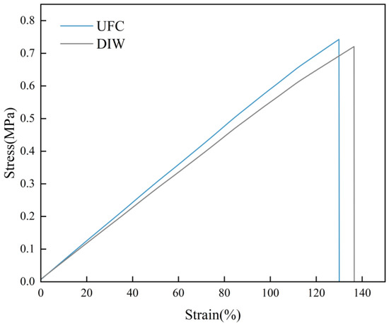 Apart from dimensional accuracy, mechanical properties are also among the key factors in the application of silicone rubber products. The silicone rubber ink with a 25 wt% PTFE addition was selected to study the stress–strain curve of the parts printed by the UFC method. The nozzle diameter was 0.84 mm, and the printing parameters are shown in Table S8. Dumbbell-shaped specimens, which served as the mechanical test models, were printed using the UFC printing and curing method and the DIW printing and curing method. The mechanical properties of the dumbbell models were evaluated through uniaxial tensile tests. A universal tensile testing machine was used to conduct the tensile tests on the specimens. The stress–strain curves of the silicone rubber were obtained from the experiments (Figure 18). It could be seen that the tensile strength and elongation at break of the specimens printed by UFC were 0.74 MPa and 128%, respectively. For the specimens printed by DIW, the tensile strength and elongation at break were 0.72 MPa and 134%, respectively. Evidently, there was little difference in the tensile strength and elongation at break of the specimens formed by the two printing methods. This indicated that the UFC printing process did not reduce the mechanical properties of the printed specimens.