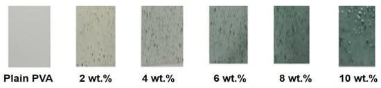 The PVA granules (86–89% hydrolyzed; M.W.: 85,000 g/mol.) were provided by Alfa Aesar Co., Ward Hill, MA, USA, The SWCNTs, of 30 μm length, diameter of 2 nm and purity of 99.99%, were supplied by Chengdu organic chemicals Co. (Chengdu, Sichuan, China). The chemicals ZnCl2 (purity > 98%), CuCl2·2H2O (purity > 99%) and NaOH (purity ≥ 95%) were purchased from Sigma-Aldrich Co., St. Louis, MO, USA. Distilled water (DW) was used as a solvent for all previous materials. The chemical bath deposition technique was followed to prepare ZnO/CuO/SWCNT nanocomposite, as shown in [,]. Briefly, an ionic solution of Zn2+, Cu2+ and SWCNTs with weight ratios of 2:1:0.02 was prepared by dissolving and stirring their precursors at 30 °C for 60 min. Next, drops of NaOH solution were added to achieve a pH of 11. After that, a brown-black precipitate was obtained. The obtained precipitate was washed several times with distilled water to remove extra residues and impurities and then dried at 80 °C for 12 h. Finally, the obtained product was calcined for 8 h at 500 °C. The solution casting method was performed to equip the PVA doped with different contents of ZnO/CuO/SWCNTs nanocomposites (ZCS NCs). To prepare a neat PVA, 1.5 g of PVA was dissolved in DW and magnetically stirred at 75 °C for 3 h till a clear solution was achieved. To prepare the ZCS PNCs, a specific amount of the ZCS NCs was added to the previous solution and stirred for an hour at 30 °C. As a result of that, in addition to the neat PVA, five solutions of ZCS PNCs were attained with ZCS contents of 2, 4, 6, 8 and 10 wt.%. After that, the prepared solutions were separately poured into Petri dishes and left for 24 h at 50 °C. The thickness of the obtained films was measured by a micrometer and found to be 0.19 ± 0.01 mm. The films were labeled from a to f, as illustrated in Figure 1.
