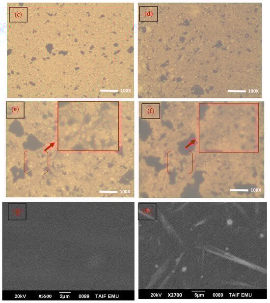 The bulk morphology of the neat PVA host and all PNCs of different ZCS contents (2, 4, 6, 8 and 10 wt.%) was examined using an optical microscope in transmittance mode with a magnification of 100×. This technique presents straightforward information about the samples’ surfaces. The captured surface images of all samples are depicted in Figure 2a–f. It is noted that the surface of the neat PVA is clear without spots and nodes (Figure 2a), while the surface images of the ZCS PNCs indicate the existence of black spots that symbolize the agglomerations of the embedded ZCS NCs. These spots are distributed homogeneously within the host PVA matrix. Moreover, the size of these clusters becomes bigger and denser upon increasing the content of the embedded ZCS NCs. The color of the PNCs becomes darker as the ZCS NCs concentration is increased from 2 wt.% to 10 wt.%. Furthermore, clear branches and nets are detected in the PNCs’ bulks of the large embedded contents of ZCS NCs (8 wt.% and 10 wt.%) (insets of Figure 2e,f). These branches symbolize the SWCNTs that are extended within the host matrix. The optical microscopy examinations ensure the successful integration between the ZCS NCs and the host PVA matrix. Moreover, the scanning electron microscope (SEM) was used to examine the morphology of the sample surfaces, as presented in Figure 2g for neat PVA and Figure 2h for 6 wt.% ZCS PNCs. It is clearly noted that the SEM micrograph of neat PVA is free from any spots, while the SEM micrograph of the ZCS PNCs shows clear spots and quasi rods related to SWCNTs.
