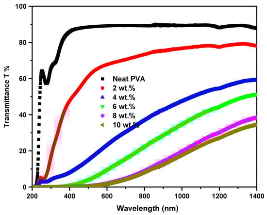 The insight variations in the optical performance of the host PVA due to ZCS NCs embedding were studied based on the UV-Vis. measurements. Investigating the optical properties of the ZCS PNCs is essential to recommend their applications in fabricating optical devices. The concentration impact of the ZCS NCs embedding on the optical transmittance (T) of the PVA was examined in the wavelength range from 200 nm to 1400 nm, as depicted in Figure 4. It is obvious that the T of the host PVA reduced upon raising the ZCS NCs contents up to 10 wt.%. Also, clear red-shifts in the cut-off edges to longer wavelengths, from 216 nm (neat PVA) to 560 nm (10 wt.% ZCS PNCs), can be noticed. For example, the 4 wt.% ZCS PNCs could cut off the majority of the UV spectrum (<380 nm), which qualifies it for optical window applications. The rest of the PNCs possess different cut-off edges, which qualify them as filters. The reduction in the transmittance and red-shift observations are attributed to increases in the absorption that reveal a shrinkage of the PVA optical bandgap as a result of ZCS embedding. The incorporation of the ZCS NCs with the PVA host creates localized energy states between the highest occupied molecular orbital (HOMO) and lowest unoccupied molecular orbital (LUMO) of PVA. This behavior leads to a decrease in the optical bandgap and, hence, the cut-off edge is red-shifted. The capability of tailoring the cut-off edge of PVA optical transmittance nominates the ZCS PNCs for applications in optical windows and filters. Furthermore, the absorption edges found at 279 nm and 330 nm in the T spectrum of the neat PVA are assigned to π→π* and n→π* bands transitions [].