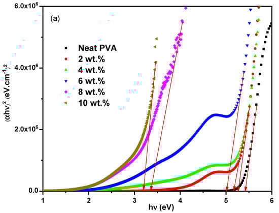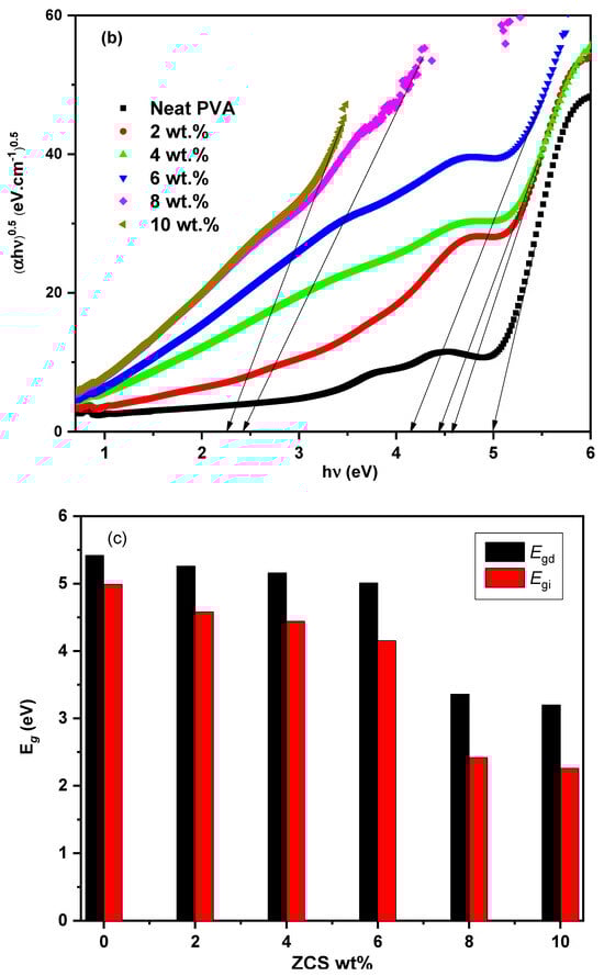 The impact of the ZCS embedding on the PVA optical bandgap (Eg) was explored using Tauc’s method (Equation (1)). The relation between (αhν)2 and (αhν)0.5 and hν for the neat PVA and different ZCS PNCs is presented in Figure 5a,b to investigate the direct and indirect Eg values, respectively. The intersection of the extended linear parts of the plotted curves to hν = 0 equals the Eg values. It is found that both direct and indirect Eg values of PVA decreased from 5.42 eV and 4.99 eV (neat PVA) to 3.20 eV and 2.26 eV (10 wt.% ZCS PNCs), as presented in Figure 5c. These results are compatible with the optical transmittance findings. The reduction in the PVA Eg value is understood in terms of the localized energy levels created between the highest occupied molecular orbital and the lowest unoccupied molecular orbital of the host PVA due to ZCS embedding [,]. Additionally, the ZCS embedding results an increment in the vacancies and defects in the PVA host []. Tuning the optical bandgap of PVA through ZCS embedding is considered a novel result of the current study, which nominates the ZCS PNCs for a lot of applications in optical devices, such as LEDs, photovoltaics and solar cells. The same observations have been reported in previous works [,,].