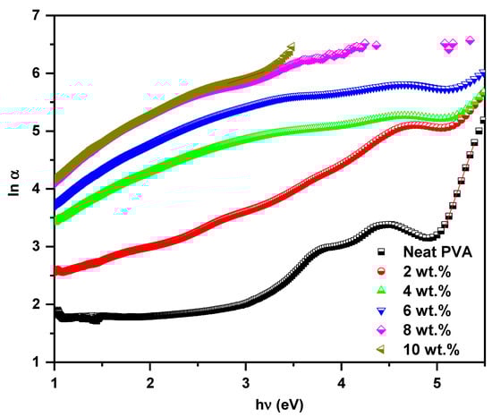 The interpretation of the optical bandgap reduction in the PVA host as a result of ZCS embedding is verified on the basis of Urbach energy investigation (Equation (2)). The relation between the logarithm of the absorption coefficient (lnα) and photon energy (hν) of the neat PVA and all ZCS PNCs is presented in Figure 6. The Urbach energy (Eu) value equals the slope’s inverse of the linear and fits just below the optical bandgap values. It is found that the Eu of the neat PVA is 0.21 eV, and it rises up to 1.85 eV for the 10 wt.% ZCS PNCs. This result indicates that the disorder feature and vacancies density of the PVA host increased considerably due to ZCS embedding [,]. The increment in the vacancies density and localized energy states of PVA due to ZCS embedding led to the optical bandgap reduction and, hence, improved the absorption.