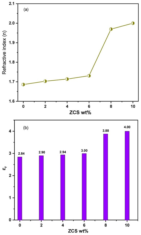 The refractive index is a crucial parameter in recommending the validity of the ZCS PNCs for applications in optical devices. The refractive index of an optical material presents information about its performance due to electromagnetic wave propagation. The values of the refractive index (n) of the neat PVA and all ZCS PNCs at a photon energy equal to their optical bandgap values were computed by the Dimitrov–Sakka equation (Equation (3)) and are illustrated in Figure 7a. It is noticeable that the n value of the neat PVA increased gradually from 1.69 to 1.73 upon raising the concentration of ZCS NCs from 0 to 6%. In contrast, it increased rapidly to 1.97 and 2.0 as the ZCS content rose to 8% and 10%. These findings are discussed in terms of the reflectance increase as a result of the increment in the vacancies and defects due to ZCS embedding. Also, the increase in ZCS contents led to a growth in the polarization and refractive index []. Moreover, the increment in ZCS embedding increases the packing density, hence enhancing the refractive index []. The same trend related to Co0.2Zn0.2Cd0.6Fe2O4 doped in PVA was reported by Mostafa et al. []. The refractive index enhancement of PVA through ZCS embedding qualifies it for microlens components, waveguides, reflecting and anti-reflecting surfaces, image sensors and optical communications [,]. Moreover, the impact of ZCS concentration on the dielectric constants (real εr and imaginary εi) of PVA has been investigated. The εr and εi constants of all samples were calculated using Equations (4) and (5) and are illustrated in Figure 7b and c, respectively. Obviously, the εr and εi of PVA are enhanced from 2.84 and 0.00083 to 4 and 0.0053 as a result of ZCS embedding. The enhancement in the εr and εi constants is attributed to the improvement in the absorption and polarization, respectively. Similar observations are reported in Refs. [,,]. These εr and εi findings are preferable in fabricating supercapacitors and energy storage devices. Furthermore, the optical conductivity (σopt.) is another optical parameter that deals with the optical response to the incident photons and the production of the charge carriers. σopt. values of the neat PVA and all ZCS PNCs were calculated by Equation (6) and are depicted in Figure 7d. According to that, the σopt. of PVA was enhanced significantly upon the increments in ZCS contents up to 10%. The σopt. improvement is mainly attributed to the absorption enhancement and, hence, an increase in the charge carrier production. Moreover, the increment in ZCS contents facilitates the charge carriers’ transition and hopping [].