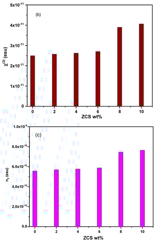 The nonlinear optical (NLO) performance of neat PVA and different ZCS PNCs has been explored to establish their appropriateness in NLO requests. The NLO applications include 3D optical data storage, frequency converters, optical limiting, lasing switching and telecommunications [,,,,]. The NLO response deals with the nonlinear polarization that appears as a result of electromagnetic wave propagation. Mainly, the first linear optical susceptibility (χ(1)), third NLO susceptibility (χ(3)) and NLO refractive index (n2) were computed using Tichy et al.’s equations (Equations (7)–(9)) and are displayed in Figure 8a, b and c, respectively. Noticeably, all NLO parameters (χ(1), χ(3) and n2) of the PVA were enhanced considerably through ZCS embedding. Particularly, χ(1) increased from 0.147 esu (neat PVA) to 0.239 esu (10% ZCS PNCs), i.e., about 63% enhancement. The χ(3) of PVA increased from 2.49 × 10−11 esu to 4.06 × 10−11 esu, and the n2 rose from 5.57 × 10−10 esu to 7.65 × 10−10 esu due to 10 wt.% ZCS embedding. This valuable enhancement in the NLO parameters is attributed to the reinforcement of PVA’s covalence and ionic chemical bonds by ZCS embedding []. These results nominate the fitness of ZCS PNCs for a lot of NLO applications [,,]. Similarly, Zyoud et al. [] reported that ZnO boosted the NLO parameters of the PVA/PVP blend for optical limiting applications.