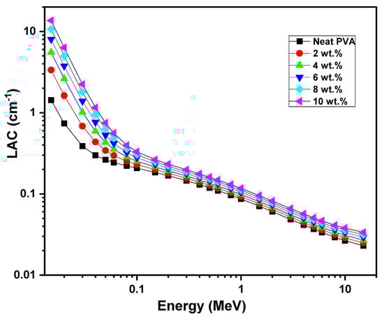 The samples’ performance in the radiation shielding application was explored using Phy-X/PSD software. Many previous works reported in the literature showed the compatibility between the experimental radiation shielding findings and those obtained using Phy-X/PSD software [,,,]. The linear attenuation coefficient (LAC) values of the neat PVA and different contents (2, 4, 6, 8 and 10 wt.%) of ZCS embedded in PVA at a wide range of photon energies (0.015 MeV to 15 MeV) were calculated (Equation (11)) and are illustrated in Figure 9. It is clear that the LAC of each sample decreased upon increasing the photon energy up to 15 MeV. Also, an increment in the LAC of the PVA can be noticed as the ZCS concentration increases. For example, the LAC of PVA was enhanced by one order of magnitude as a result of 10 wt.% embedding of ZCS NCs at a photon energy of 0.015 MeV. The increment in LAC due to ZCS embedding is mainly attributed to the photoelectric effect and density increase [,]. More ZCS embedding in PVA leads to more interaction between the photons and the medium atoms and, hence, enhances the γ-radiation protection characteristics [,].
