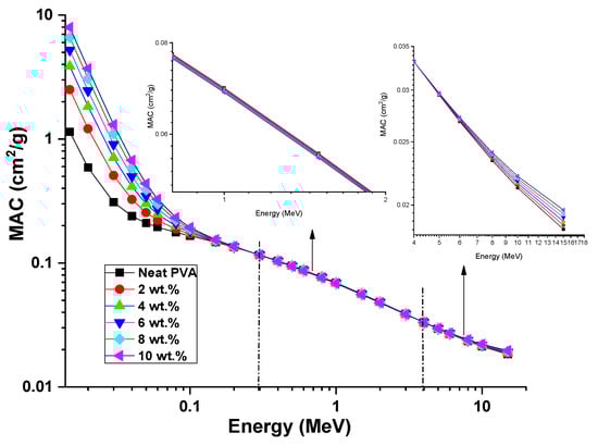 MAC of neat PVA and different (2 to 10 wt.%) ZCS PNCs. Insets show MAC in photon energy range from 0.3–4 MeV and 5–15 MeV.