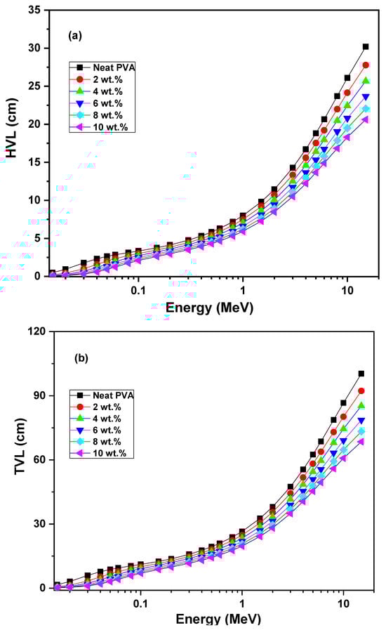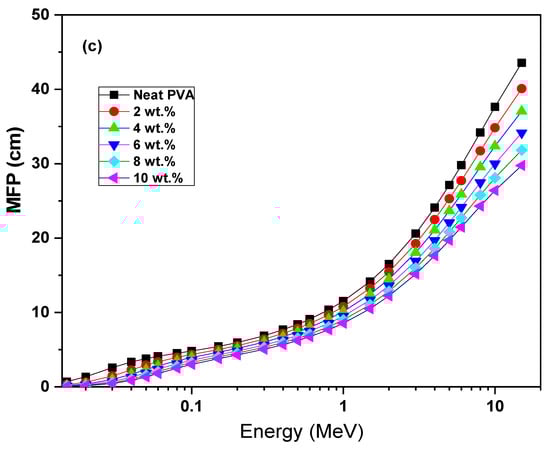 Furthermore, the radiation shielding parameters of the half value layer (HVL), tenth value layer (TVL) and mean free path (MFP) related to the neat PVA and ZCS PNCs were also computed (Equations (13)–(15)) over the photon energy 0.015–15 MeV range and are presented in Figure 11a to c, respectively. The HVL factor represents the sample’s thickness where the γ-radiation intensity is reduced to the half value, whereas the TVL is the thickness where the intensity is reduced to the tenth value. The MFP is the mean thickness at which the γ-radiation travelled before attenuation. Noticeably, the samples’ HVL, TVL and MFP perform opposite trends, noted for their LAC and MAC. In other words, HVL, TVL and MFP values increased upon increasing the photon energy. The increment in the ZCS content embedded in the host PVA led to reductions in its HVL, TVL and MFP values. As an example, at 15 MeV, the HVL of PVA decreased from 30.2 cm to 20.6 cm, the TVL decreased from 100.3 cm to 68.5 cm and the MFP decreased from 43.6 cm to 29.8 cm upon embedding 10 wt.% of ZCS NCs. These trends are discussed in terms of the reduction in the γ-ray interaction cross-section phenomenon and LAC values []. Increasing the photon energy leads to an increase in the penetrated thickness of the samples. The valuable findings of the HVL, TVL and MFP reveal the validity of ZCS PNCs in applications in gamma radiation shielding. The same observations connected to BiVO4 filled in PVC polymer are reported by Kassem et al. [].