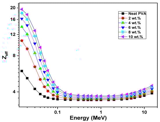 Moreover, the impact of ZCS content and incident photon energy ranging from 0.015 to 15 MeV on the effective atomic number (Zeff) parameter of PVA have been examined (Equation (16)) and are displayed in Figure 12. The Zeff factor represents the effective atomic number at the attenuated photon energy []. It is noted that the Zeff decreased deeply with increases in the photon energy from 0.015 MeV to 0.1 MeV, then it performed steadily from 0.2 MeV to 3 MeV and increased slowly from 4 MeV to 15 MeV. Furthermore, at any photon energy, the Zeff value increased upon the increment in the ZCS content up to 10 wt.%. For example, the Zeff of PVA at 0.015 MeV increased from 6 to 19.5 due to 10 wt.% of ZCS embedding. This increment in Zeff value is attributed to the photoelectric effect. In addition, increasing the ZCS content leads to an increment in the backing density and, hence, the Zeff parameter. Similar trends are reported in previous works [,].