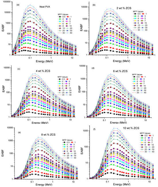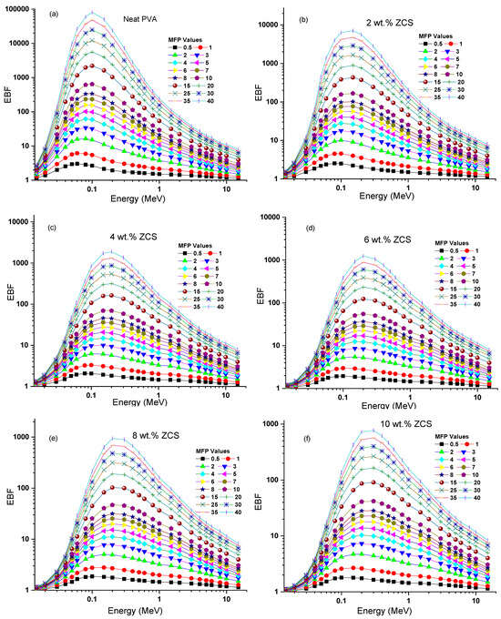 Furthermore, the secondary ionizing radiation could be addressed by investigating the buildup factors of the prepared samples []. The buildup is divided into factors: exposure buildup factor (EBF) and energy absorption buildup factor (EABF). The EBF and EABF of the neat PVA and different contents of ZCS PNCs versus photon energy (0.015 MeV to 15 MeV) were computed by the geometric progression fitting method at different MFP values (0.5 to 40) and are presented in Figure 13a–f and Figure 14a–f, respectively. Noticeably, as the photon energy increased, each EBF and EABF of a sample increased, reached a peak and then decreased. The maxima points of the EBF and EABF of each sample decreased upon increasing the ZCS content at any specific MFP value. This behavior indicates an enhancement in the radiation shielding feature of PVA through ZCS embedding. The performance of each EBF and EABF comprised three discrete regions of photon energy: low, medium and high. These zones are sequentially connected to the photoelectric effect, Compton effect and pair production []. The low-energy regions possess the highest buildup factors, indicating the importance of the photoelectric effect and gamma-ray absorption. The same trends are reported in ref. []. The samples’ EBF and EABF depend mainly on their composition, energy range and penetration depth. The EBF and EABF increments indicate the deep penetration of the sample. The findings enclosed in this study prove that the EBF and EABF performance of PVA is significantly affected by embedding with ZCS NCs, nominating it for applications in gamma radiation shielding.