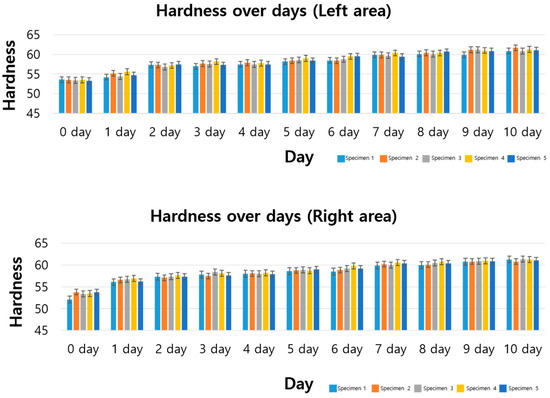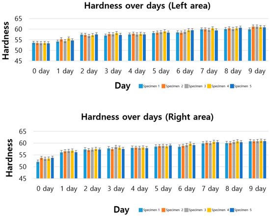 - Increase in hardness: In all specimens, hardness tended to increase as ozone exposure time increased;