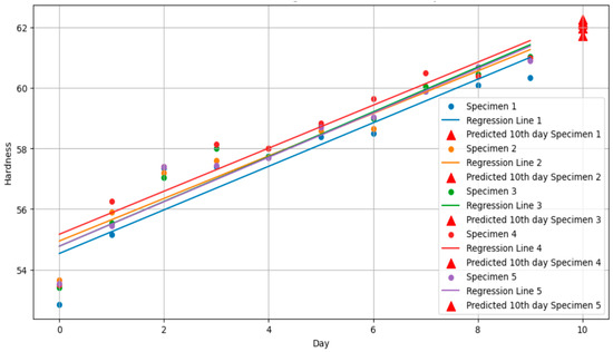 - Model suitability: The coefficient of determination (R2) value is between 0.87 and 0.92, confirming that the linear regression model explains the hardness change data well;