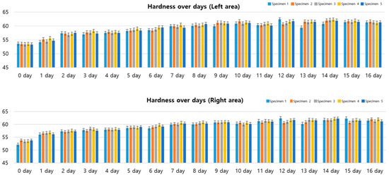 - Pearson correlation coefficient evaluation: Pearson correlation coefficient was calculated to evaluate the linear relationship between ozone exposure time and hardness, and a positive correlation was found in all specimens. The values shown in the table are all between 0.94 and 0.96, showing a very high positive correlation. This indicates that there is a strong positive linear relationship between ozone exposure time and hardness change, meaning that as the exposure time increases, the hardness also steadily increases.