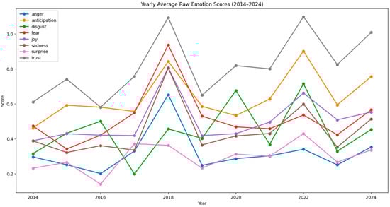 Figure 1 and Figure 2 show raw and normalized results on the emotional trends in bioplastic-related discussions per year over a ten-year period, from 2014 to 2024. Figure 3 and Figure 4 show raw and normalized results on the emotional trends in bioplastic-related discussion per quarter over a ten-year period, from 2014 to 2024. The analysis was conducted using a sentiment analysis tool (NRCLex) that categorized emotions into eight categories: anger, anticipation, disgust, fear, joy, sadness, surprise, and trust. The sentiment scores were normalized to take into consideration the variations in word count, ensuring that the results were not being biased by changes in comment volume across the years. The resulting trends offer insights into public emotions around bioplastics during this decade.
