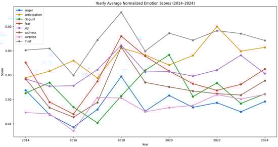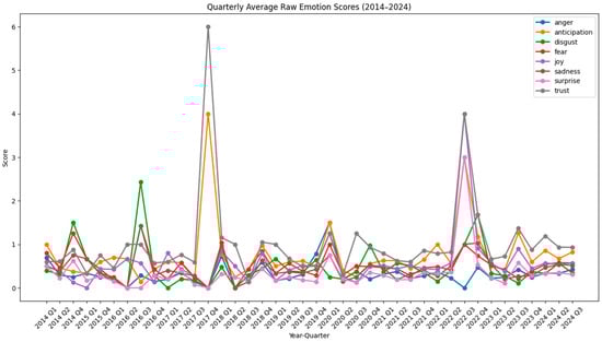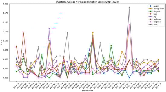In the quarterly normalized graph (Figure 4), the y-axis represents the normalized emotion score, which is a proportion or percentage that reflects the frequency of an emotion relative to the total number of words associated with any emotion in that quarter. Emotions scores range from 0.01 to 0.2 because scores are calculated in a shorter period (3 months), which leads to more extreme fluctuations.