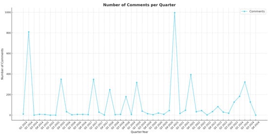 For 2015, a total of 355 comments were extracted, with 349 of these occurring in Q4 of that year. This spike in comments aligned with the Paris Agreement [70], which was held in December of that year, suggesting that this important climate agreement may have increased public engagement on plastic-related topics. Additionally, in September of that year, slightly before Q4, the Sustainable Development Goals (SDGs) were adopted at the UN Summit [71], a very significant global milestone. The main emotions prevailing during Q4 of 2015 were trust, anticipation, and disgust, while the top words people were referring to were plastic(s), biodegradable, PLA, utensils, recyclable, and oil (see Supplementary Material). Similarly, for 2018, a total of 438 comments were extracted, with 248 comments recorded in Q1. This coincided with the introduction of the European Union Plastic Strategy in January 2018 [72], indicating that major policy announcements can significantly influence public conversation about environmental issues. The main emotions present during Q1 of 2018 were trust, fear, and sadness, while the main words people talked about were wound, healing, work, tissue, fetal, scar, cells, and blood. Moreover, of 376 total comments extracted in 2019, 317 of them were noted in Q2. This happened at the same time as the EU Single-Use Plastics Directive event in June of that year [73]. The main emotions prevailing during Q2 of 2019 were joy, trust, and anticipation and the main words people used were plastic(s), spider, glue, better, good, people, and cost. Finally, a last possible correlation is the one of 996 comments extracted in Q1 of 2021, coinciding with Biden’s administration rejoining the Paris Agreement in January of 2021 [74]. The most frequent emotions during Q1 of 2021 were disgust, trust, and anticipation and the most prevailing words were plastic(s), recycling, cost, oil, plant, and water.