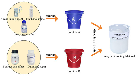 Mixing procedure: Solutions A and B were mixed at a mass ratio of 1:1. If the gelation time was too short, a diluted retarder was added to adjust. The preparation process is illustrated in Figure 2.