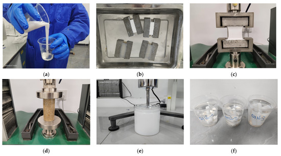 Water Absorption Test of Gel: The mixed slurry was quickly poured into plastic tubes with a diameter of 10 mm and a length of 50 mm. After curing for 24 h, the samples were demolded. The initial mass (m0) of the specimens was weighed, and then the specimens were immersed in 500 mL of deionized water. After wiping off the surface water, the mass (m1) of the specimens was measured at different curing ages, and the water absorption rate (X) was calculated using Equation (1) (Figure 3f).