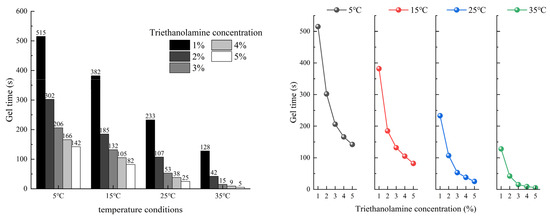To study the influence of temperature and triethanolamine content on the gelation time of acrylate grouting materials, the concentration of acrylate in Solution A was fixed at 35%, the crosslinker was fixed at 5%, and the sodium persulfate in Solution B at was fixed at 1%. The gelation time was investigated at temperatures ranging from 5 °C to 35 °C with varying triethanolamine content amounts. The results are shown in Figure 4. At 5 °C, as the triethanolamine content increased from 0.5% to 2.0% and the gelation time decreased from 1200 s to 280 s. At 35 °C, the gelation time decreased significantly from 360 s to 25 s over the same triethanolamine content range.