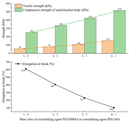 The mechanical properties of acrylate grouting materials mainly depend on the regulation of the polymer network structure by crosslinkers. In this experiment, the concentration of acrylate in Solution A was fixed at 35%, the promoter was fixed at 3 parts, the total crosslinker was fixed at 5 parts, and the sodium persulfate in Solution B was fixed at 1%. The effect of different ratios of bifunctional crosslinker PEG500DA to monofunctional crosslinker PEG-MA (ranging from 1:4 to 4:1) on the mechanical properties of the material was investigated. The results are shown in Figure 6.