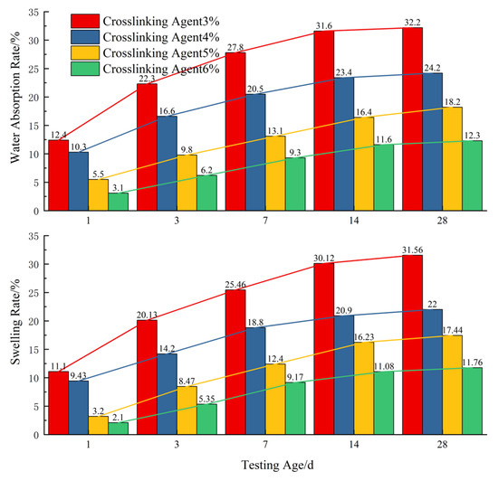 The total amount of the crosslinker significantly affects the water absorption and swelling properties of the modified acrylate gel. Under fixed conditions of an acrylate concentration (35%), promoter (3 parts), and the PEG500DA/PEG-MA mass ratio (2:3), as the total crosslinker content increases from 3.0% to 6.0%, the 28-day water absorption rate of the gel decreases from 36% to 12%, and the volume expansion rate decreases from 32% to 11%. All samples exhibit a rapid water absorption rate and volume expansion in the initial immersion period (0–14 days), followed by a significant slowdown in the rate of increase, stabilizing after 14 days.