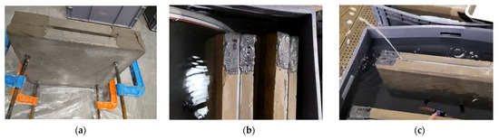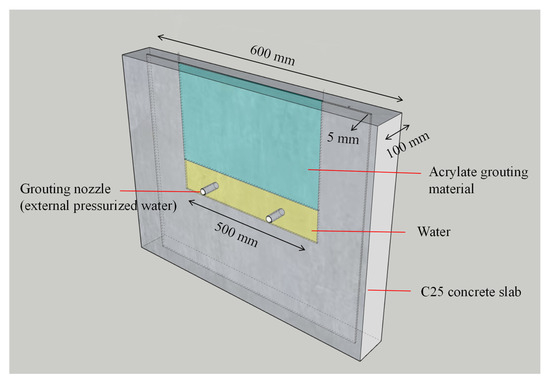 To evaluate the long-term anti-extrusion performance of modified acrylate grouting materials under pressurized water conditions, a set of simulated concrete crack water pressure test devices was designed. The devices consist of two 600 mm × 600 mm × 50 mm concrete plates stacked together, with the crack width controlled between 2 and 5 mm using spacers. The grouting nozzle is installed at the center of the side of the crack, and the interface between the nozzle and the concrete plate is sealed with epoxy resin to ensure that the grout only leaks from the crack (as shown in Figure 9). Due to the limited pressure-bearing capacity of the test mold, G-clamps are installed around the concrete plates to prevent deformation or rupture under water pressure. The samples are immersed in deionized water at 25 ± 2 °C for 1, 3, 7, 14, 28, and 56 days, and then tested according to the SL31–2003 [25] “Water Pressure Test Procedure for Water Conservancy and Hydropower Engineering Drilling.” The pressure is increased stepwise at 0.05 MPa intervals, with each step maintained for 30 min, and the maximum pressure value at which leakage occurs is recorded (as shown in Figure 10).
