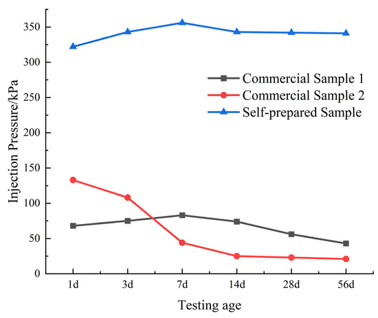 In the experiment, the performance of the developed modified acrylate grouting material was compared with two commercially available acrylate grouting materials under the same conditions. The results of the water pressure test at different ages are shown in Figure 11. The experimental results show that the three materials exhibit significant differences under water pressure: Market Sample 1 has a lower initial anti-water pressure strength (about 68 kPa) but relatively stable performance, remaining at around 43 kPa after 56 days. Market Sample 2 has a higher initial anti-water pressure strength (about 133 kPa), but the strength drops sharply after 3 days of immersion, reaching only 20% of the initial value after 56 days. In contrast, the modified acrylate developed in this study exhibits excellent anti-extrusion performance, with an anti-water pressure strength of 300 kPa after 1 day, which continues to increase and stabilizes at around 350 kPa after 56 days, providing long-term water stoppage.