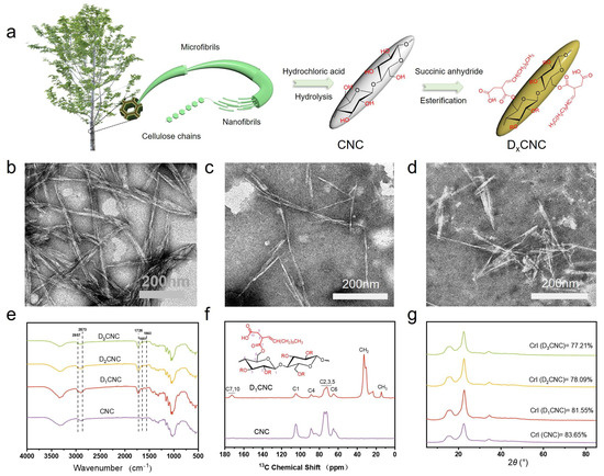 (a) Schematic diagram of DxCNC preparation process; (b–d) TEM images of (b) CNC, (c) D2CNC, and (d) D3CNC. (e) FTIR spectra of CNC and DxCNC; (f) Solid-state 13C NMR spectra of CNC and DxCNC; (g) XRD patterns of CNC and DxCNC.