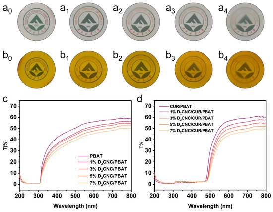 (a) Photos of (a0) PBAT film, (a1) 1% D2CNC/PBAT composite film, (a2) 3% D2CNC/PBAT composite film, (a3) 5% D2CNC/PBAT composite film, and (a4) 7% D2CNC/PBAT composite film; (b) Photos of (b0) CUR/PBAT composite film, (b1) 1% D2CNC/CUR/PBAT composite film, (b2) 3% D2CNC/CUR/PBAT composite film, (b3) 5% D2CNC/CUR/PBAT composite film, and (b4) 7% D2CNC/CUR/PBAT composite film; (c) Transmittance of PBAT and D2CNC/PBAT films; (d) Transmittance of CUR/PBAT and D2CNC/CUR/PBAT films.
