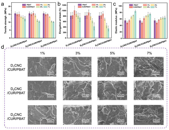 (a–c) Mechanical properties of pure PBAT and its nanocomposites: (a) tensile strength, (b) elongation at break, and (c) elastic modulus. (d) SEM images of the fractured cross-section of DxCNC/CUR/PBAT composite films.