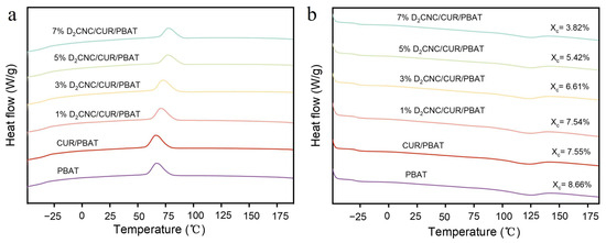 where Xc is the crystallinity of the sample; ∆Hm is the enthalpy of fusion; ∆Hcc is the enthalpy of cold crystallization; is the heat of PBAT when it is fully crystallized enthalpy (114 J/g); and w is the mass fraction of PBAT in the composite film.