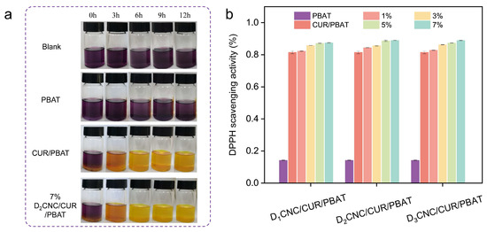 (a) Photos of the DPPH solutions after 0 h, 3 h, 6 h, 9 h, and 12 h of incubation with the composite films. (b) DDPH radical scavenging activities of PBAT, CUR/PBAT, and DxCNC/CUR/PBAT films.