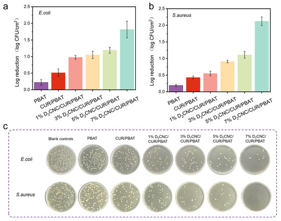 Antibacterial performance values of PBAT, CUR/PBAT, and D2CNC/CUR/PBAT composite films: (a) E. coli; (b) S. aureus; (c) Panel of photographs after 24 h incubation.