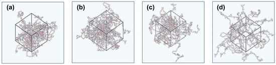 Molecular dynamics simulation (MS) technology has become a new method in material research due to its efficiency, practicality, versatility, and stability [32,33]. First, the molecular structure drawing tool in the Material Visualizer module of the Materials Studio 2020 MD simulation software was used to construct molecular chain structures of different water-based polyurethane (WPU) systems based on the ratios of PCD, IPDI, CHDM, and DMPA in four types of WPU with varying hard segment contents. Then, the Amorphous Cell Tools module was used to synthesize the WPU unit cell model. The temperature was set to 298 K, the pressure to atmospheric pressure (0.0001 GPa), and the initial relative density to 1.2 g/cm3. The Geometry Optimization (GEO) module was applied to optimize the molecular unit cell structure. The resulting WPU model is shown in Figure 2.