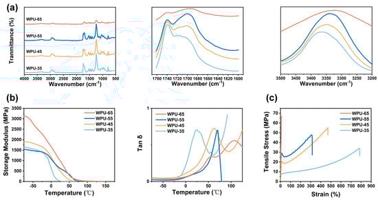 The molecular weight information of WPU was obtained using a Waters liquid chromatography system (Waters Corporation, Milford, MA, USA) with a THF-based system. The structure of WPU was analyzed using Fourier transform infrared spectroscopy (FTIR) with a PerkinElmer Spotlight infrared spectrometer (PerkinElmer, Inc., Waltham, MA, USA). The spectrum was scanned 40 times in the range of 4000–400 cm−1. The glass transition temperature (Tg) of WPU was analyzed using a Mettler Toledo TGA/DSC1 (Mettler-Toledo International Inc., Columbus, OH, USA) differential scanning calorimeter. The test was conducted in a nitrogen atmosphere with a heating rate of 15 °C/min. The temperature was first increased from room temperature to 150 °C and then cooled to eliminate the thermal history of the material. Subsequently, the sample was heated from −50 °C to 120 °C to obtain DSC data. Dynamic mechanical analysis (DMA) of WPU was performed using a TA Q800 (TA, New Castle, DE, USA) dynamic mechanical analyzer in tensile mode, with a heating rate of 3 °C/min and a frequency of 1 Hz. The temperature range for the measurement was −80 °C to 150 °C, and the storage modulus and loss factor (tan δ) were obtained. The tensile properties of WPU were measured using an Instron universal testing machine (Instron Corporation, Norwood, MA, USA) at a tensile rate of 500 mm/min.
