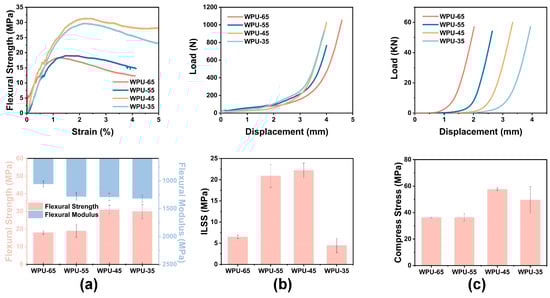 Under the high-speed impact of a bullet, composite materials are subjected to compressive waves along the thickness direction [54], resulting in compression damage. Higher axial compressive strength generally contributes to improving the ballistic resistance of composite materials, as it enhances material stiffness and interlayer bonding strength, thereby increasing energy absorption capacity and reducing the projectile’s velocity within the composite. As shown in Figure 5c, the higher the hard segment content, the greater the material stiffness, and the more sensitive the load–displacement response. WPU-45/UHMWPE and WPU-55/UHMWPE exhibit higher compressive strength. This is because WPU-35, with its lower hard segment content, has excessive adhesive flexibility, causing the fibers to slip out of position, which reduces compressive strength. On the other hand, WPU-65 has a higher glass transition temperature (Tg), making molecular chain motion more difficult. The poor flowability and uneven distribution of the adhesive within the fibers further lead to a decrease in compressive strength.