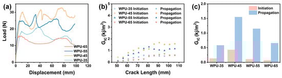 (a) Load–displacement curves of WPU-HS/UHMWPE composites. (b) R-curves of WPU-HS/UHMWPE composites. (c) Average energy release rates for crack initiation (GIC-ini) and crack propagation (GIC-prop) of WPU-HS/UHMWPE composites.