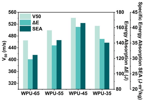 For ballistic composite materials, V50 value, energy absorption (ΔE), and specific energy absorption (SEA) are three key indicators for evaluating ballistic performance, reflecting the material’s capability in actual protective applications. Among them, the V50 value represents the critical velocity at which the material can effectively prevent a bullet from penetrating. Energy absorption describes how much energy the ballistic material can absorb during projectile impact, while SEA refers to the energy absorbed per unit areal density of the material. The V50, ΔE, and SEA values of WPU-HS/UHMWPE composite laminates are shown in Figure 7 and Table 3. For composite laminates with the same number of fiber layers, the V50 values of WPU-65/UHMWPE, WPU-55/UHMWPE, WPU-45/UHMWPE, and WPU-35/UHMWPE are 465, 499, 541, and 514 m/s, respectively, with WPU-65 showing the lowest value. Similarly, the ΔE values are 118.92 J for WPU-65, 136.95 J for WPU-55, 160.97 J for WPU-45, and 145.31 J for WPU-35, with WPU-45 exhibiting the highest energy absorption, an increase of 35.36%, 17.54%, and 10.78% compared to WPU-65, WPU-55, and WPU-35, respectively. As for SEA, WPU-45 also outperforms the others, reaching 41.49 J·m2/kg, which is 33.28%, 15.44%, and 18.21% higher than WPU-65, WPU-55, and WPU-35, respectively. These results suggest that an excessively high hard segment content, as in WPU-65, leads to a rigid and brittle matrix with high hardness and modulus, which may hinder fiber deformation and reduce the material’s ability to absorb and dissipate energy. Consequently, high hardness and modulus in the matrix do not always enhance ballistic performance. In contrast, WPU-45 demonstrates excellent ballistic performance with a thinner laminate thickness, highlighting its superior mechanical properties that significantly improve the protective capabilities of the composite material.
