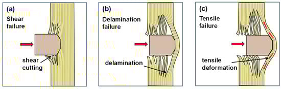 The penetration process of projectile FSP and energy absorption mechanisms: (a) Shear failure. (b) Delamination failure. (c) Tensile failure. The red arrows in the figure indicate the bullet impact.