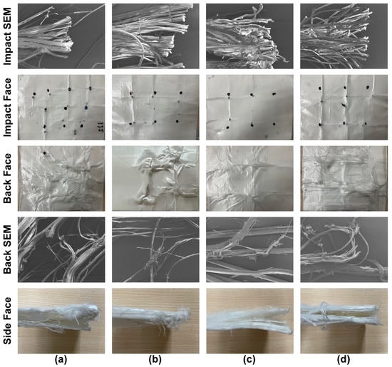 Before ballistic testing, the surfaces of the four composites were examined and gold-coated to analyze the bonding between fibers and the adhesive using a scanning electron microscope (SEM). After the ballistic tests, the surface morphology and SEM images were used to observe the deformation and failure modes of the fibers after projectile penetration.