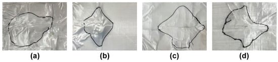 In addition, Figure 11 shows the back-face delamination areas of individual bullet holes for each sample, and the delamination areas were quantitatively analyzed using Photoshop. The measured delamination areas of WPU-65/UHMWPE, WPU-55/UHMWPE, WPU-45/UHMWPE, and WPU-35/UHMWPE are 104.13 cm2, 98.91 cm2, 50.79 cm2, and 82.93 cm2, respectively. The results reveal significant differences in delamination areas corresponding to variations in hard segment content, indicating that the interfacial bonding strength and energy dissipation capacity of the materials are influenced by their composition. Specifically, WPU-65/UHMWPE exhibited the largest delamination area due to its high rigidity and insufficient toughness, resulting in significant delamination and lower energy dissipation efficiency under impact. WPU-55/UHMWPE showed a slightly smaller delamination area, reflecting improved but still suboptimal interfacial bonding performance. WPU-35/UHMWPE, despite having better toughness, showed increased delamination due to insufficient rigidity caused by its low hard segment content. In contrast, WPU-45/UHMWPE exhibited the smallest delamination area, indicating an optimal balance between hard and soft segments, which enabled superior energy absorption and dissipation under ballistic impact.